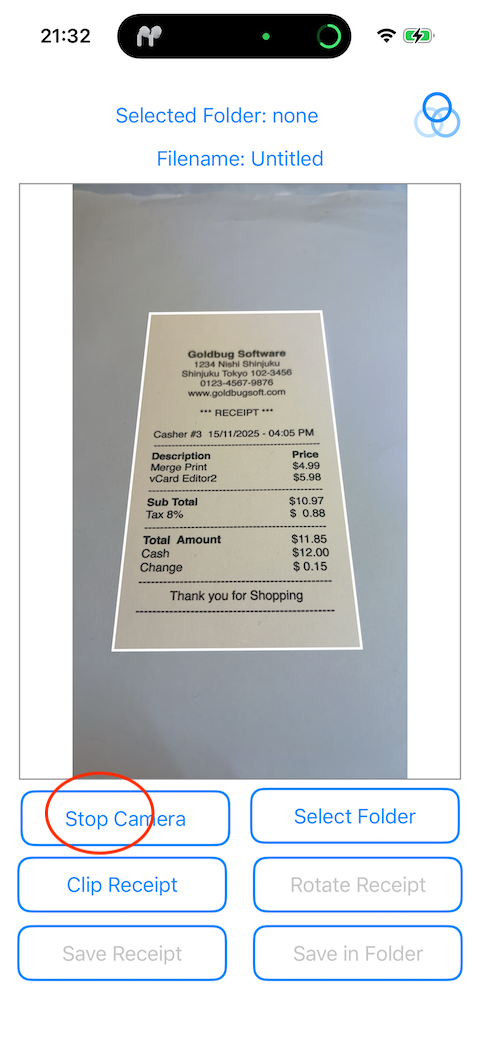 Move the camera or the receipt so that all four corners of the receipt are in the frame. Once the four corners of the receipt are recognized, a white frame will appear on the screen, so tap the "Stop Camera" button to take a photo of the receipt. The recording was successful when the video stops and a receipt with a white border appears on the screen.