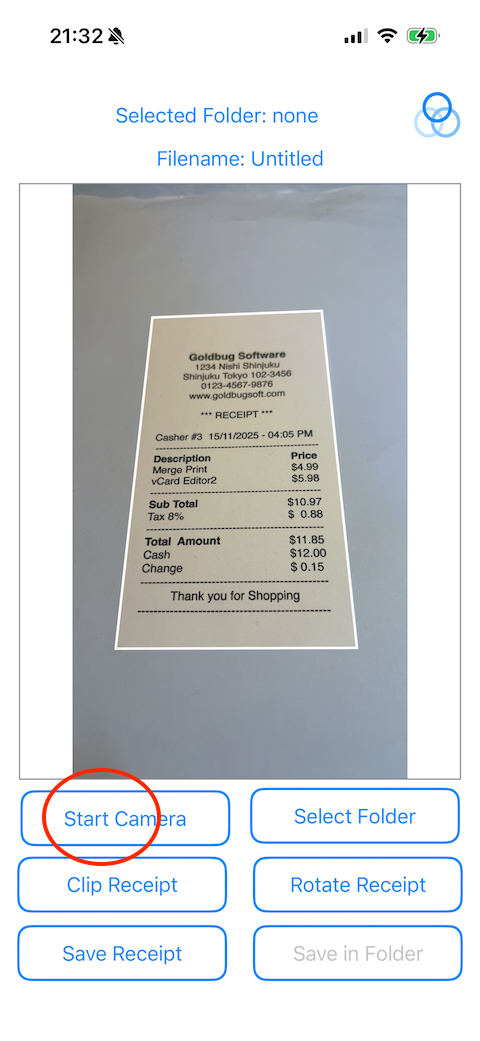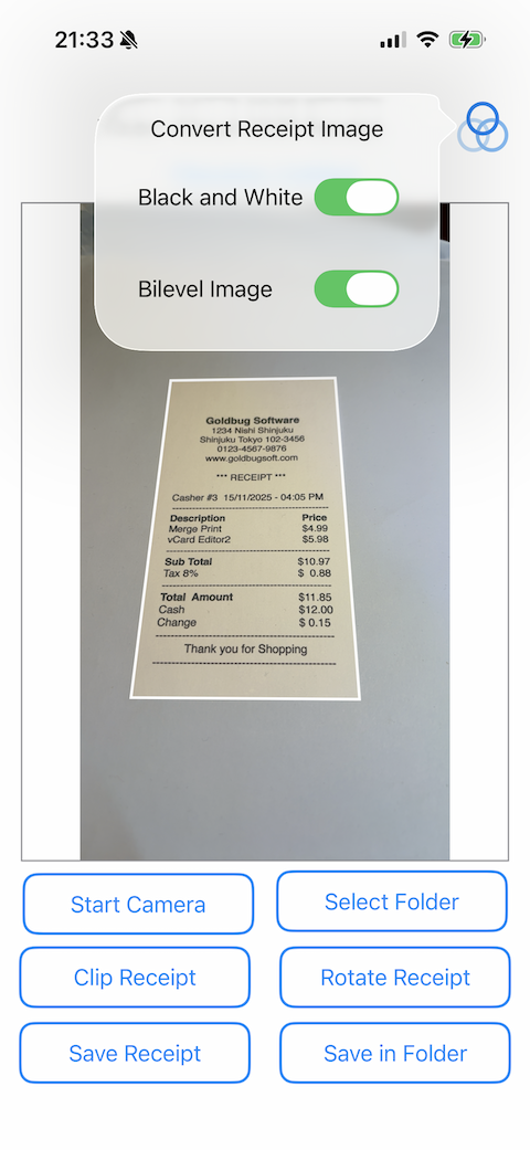 Save My Receipt is an app that lets you take a picture of receipt with iPhone camera, and convert it into small image, then save it. When taking a photo, trapezoid is converted into rectangle using image recognition, making it easy to take photos. In addition, image are converted to black and white binary image, which reduces its size and makes it easier on your iPhone's storage. And the file name is automatically created by reading the receipt date, so you can save it with just one tap. In other words, you can take a photo of your receipt and save it with just three taps: take a photo, clip, and save. This is the perfect app for those who want to organize and save their receipts.