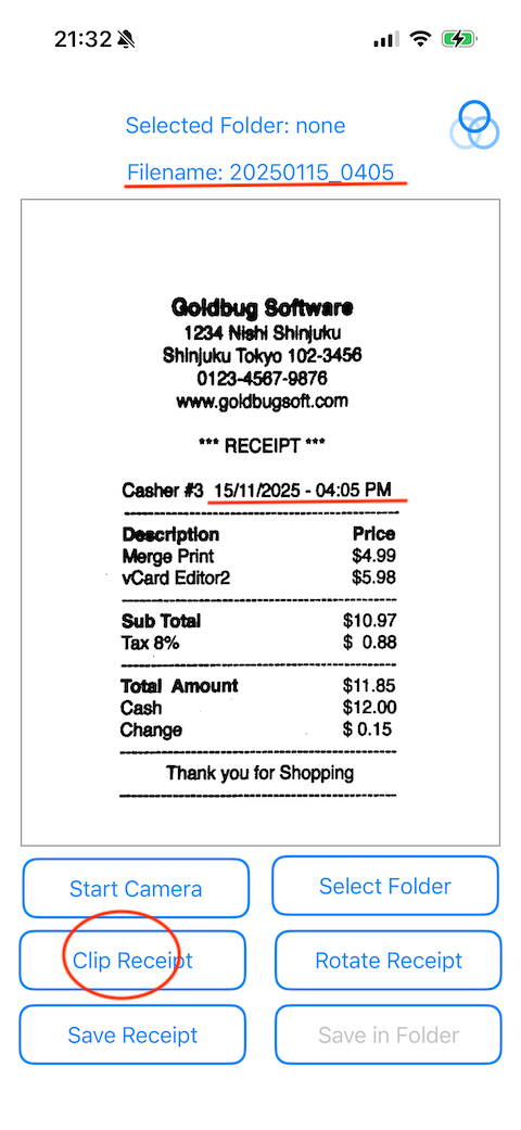 Tap the "Clip Receipt" button. The app will correct the white frame into a rectangle and crop the image to the size of the frame. Then the image is converted to black and white and binary, and the result is displayed on the screen. Additionally, the date and time is read from the receipt and displayed as the file name at the top of the screen. If the date cannot be read, the file name will not be displayed, but it can still be saved.