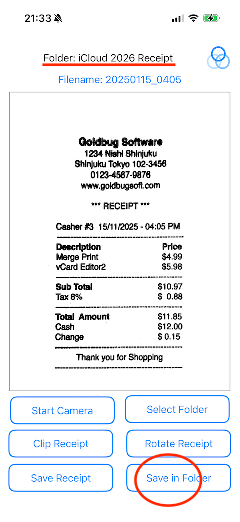When a folder is selected, the "Save in Folder" button becomes available. By tapping it, you can skip the folder selection screen and save the receipt. This is useful when taking pictures of receipts repeetdly and saving them.