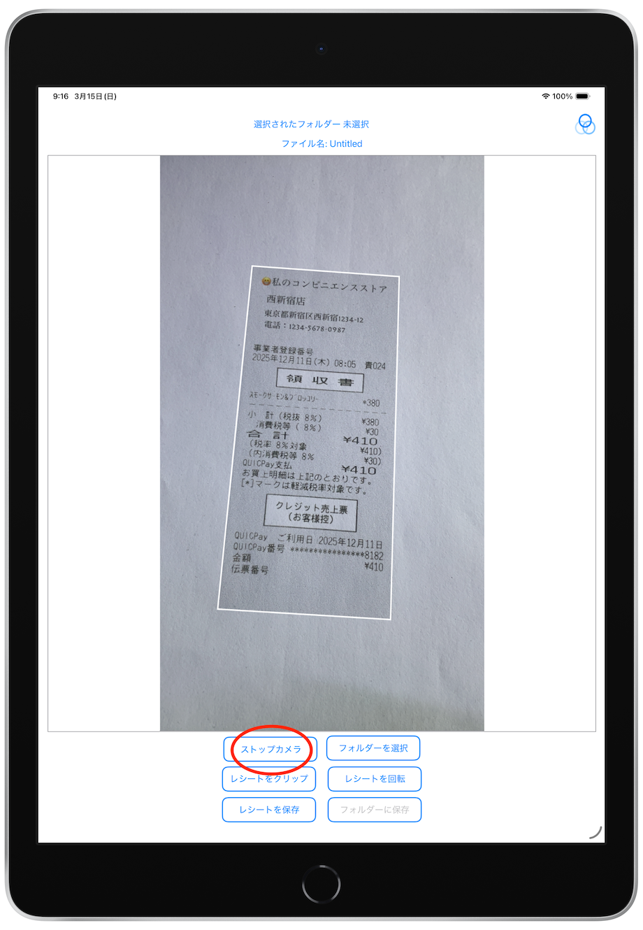 Move the camera or the receipt so that all four corners of the receipt are in the frame. Once the four corners of the receipt are recognized, a white frame will appear on the screen, so tap the "Stop Camera" button to take a photo of the receipt. The recording was successful when the video stops and a receipt with a white border appears on the screen.