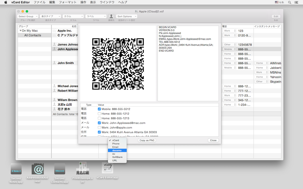 アップルの連絡先アプリ(アドレスブック)だけでなく、いろいろな連絡先アプリケーションがvCardの読み込みと書き出し機能を持っています。 また、vCard EditorはCSV形式の連絡先情報を読むことができ、また、QRCodeに変換することができます。QRCodeをイメージとして保存すれば、いろいろな書類に印刷して利用できます。